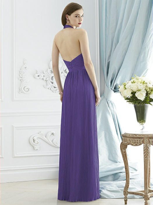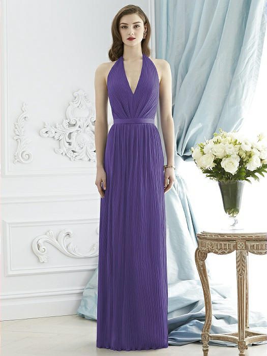 Bridesmaid Dresses | Full length pleated lux chiffon halter dress with v-neck and matching matte satin 1" belt. Slightly shirred skirt. Sizes available: 00-30W, and 00-30W Extra Length. Rush delivery not available for this style.