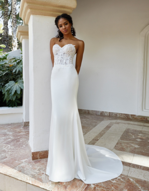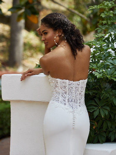 Bridal Gowns- $1500 Under | Daniella features a figure-flaunting sheath style silhouette with a rich regal crepe skirt that molds to your curves before fanning out passed the hips and into a flirtatious sweep train. Sitting atop the clean lines of this pristine skirt is radiant unlined bodice that will cater to your glamorous needs. Adorned all around with an ornate array of embroidered floral lace appliques with sequins that trickle over the drop waistline, the sheer sparkle tulle and net bodice features a sultry strapless sweetheart neckline that bares the shoulders and leaves the perfect place for any sparkly accessories you’d like to pair with this casual gown. The captivating illusion open back is finished with demure boning details that peek underneath lace appliques providing gorgeous coverage and a string of dainty covered buttons with loops running along the zipper.
