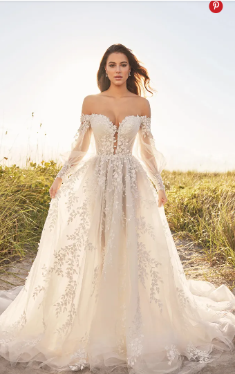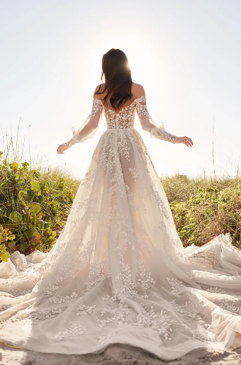 Bridal Gowns- A-Line | Capture your beloved's heart all over again in this stunning fit and flare gown. Delicate lacework, subtle beading, and flowing fabrics come together to create a look that is both ethereal and striking. The semi-sheer corseted front and back bodice tastefully accentuates and supports your curves, while the illusion fit and flare skirt adorned with floral lace applique creates breathtaking movement with every step.
