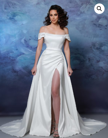 Bridal Gowns- $1200 Under | Ginger is a fitted gown made of stretch mikado. She has a slit, off the shoulder straps and is priced perfectly, at just under $1200.