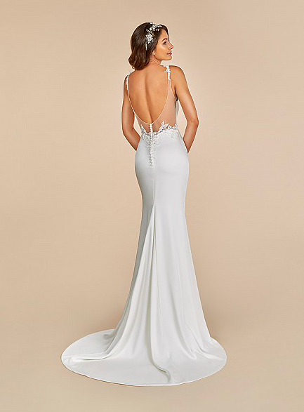 Bridal Gowns- $1500 Under | Stunning in all of its entirety, this piece features a deep V-neck neckline partnered with an illusion deep V-back that is simply stunning. Kick start that fiery fire inside of you and channel your inner goddess with a wedding dress that speaks volumes. Made with crepe back satin the dress molds into your curves and is soft and luscious for maximum comfort. Wow your guests in a dress that truly lets your beauty shine through.