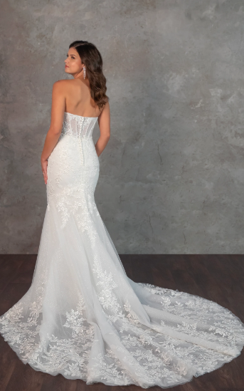 Bridal Gowns- Plus Size | A breathtaking lace masterpiece, Jansen exudes the beauty and luxury of a designer wedding gown. The strapless plunging sweetheart neckline accentuates the intricately structured bodice, where architectural corsetry blends old world romance with contemporary fashion. Exposed beaded boning and detailed lace appliques create a mesmerizing effect, cascading over the fit-and-flare skirt before flowing into a shimmering, dream-like train adorned with lace accents. The result is a striking and sophisticated bridal look designed to captivate from every angle. This gown is also available in plus sizes in the bodice-lined option.