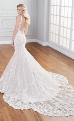 Bridal Gowns- Fitted | Maple is an alluring and modern take on the traditional fit and flare silhouette. Delicate beaded floral Schiffli lace appliqué and perfectly placed ribbon lace sculpt your curves and draw the eye down to a spectacular tulip-shaped cathedral train. A sensual deep plunge sweetheart neckline and low scooped back add a touch of seduction.