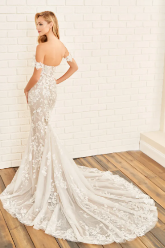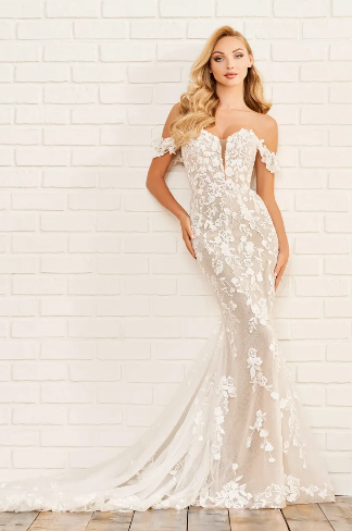 Bridal Gowns- Fitted | Say "I do" to Morraine, a romantic fit and flare gown. This breathtaking bridal style is sure to make a statement with its sultry sweetheart neckline, semi-sheer plunge insert, and delicate 3D floral applique detailing. Draped off-the-shoulder sleeves add an element of whimsy that is simply dreamy.