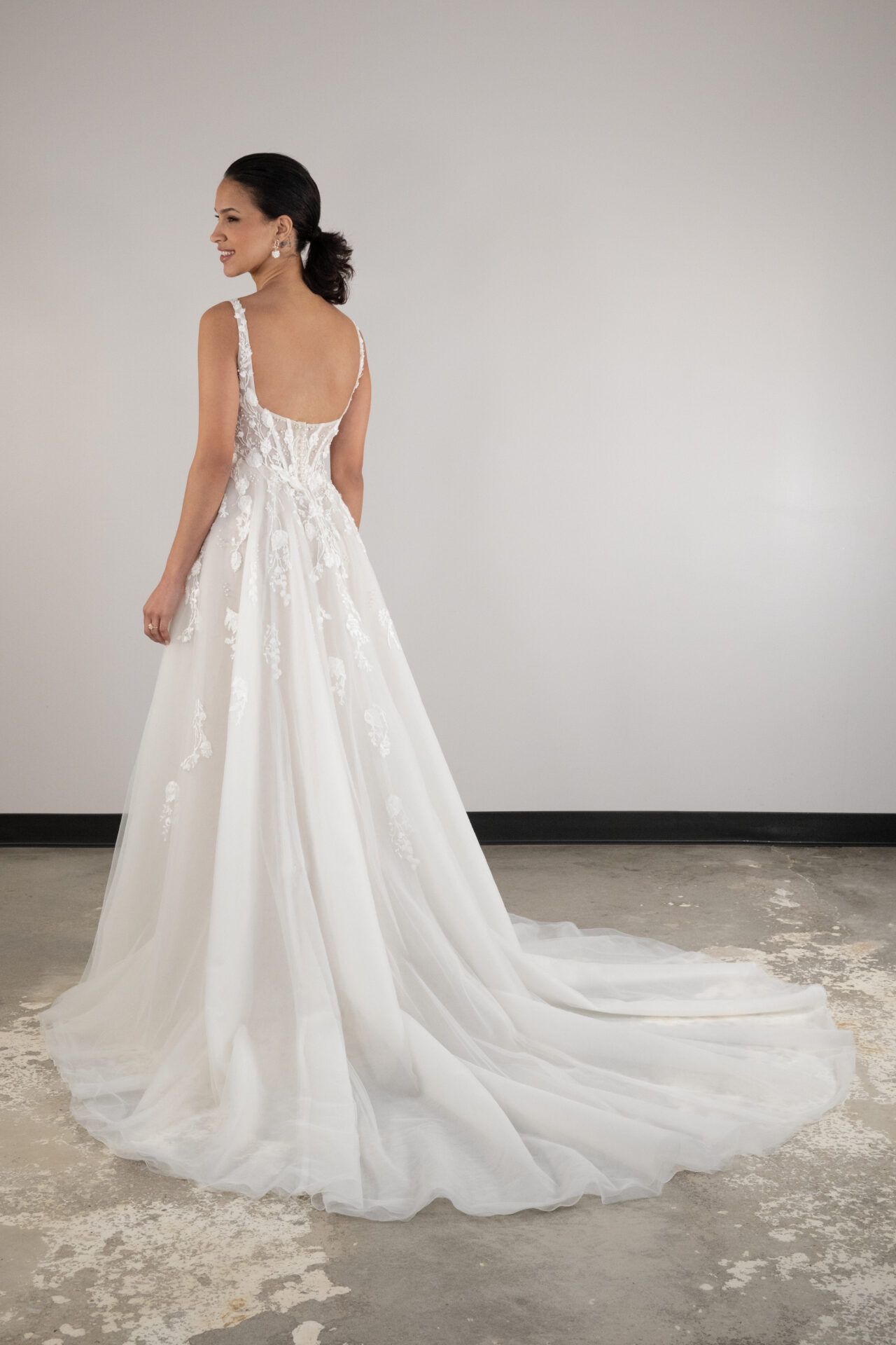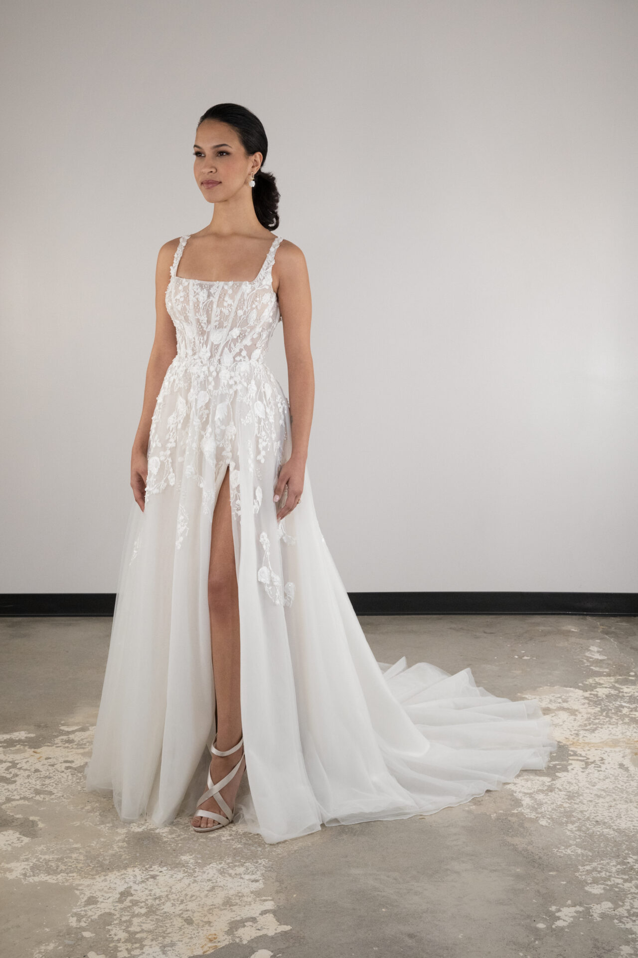 Bridal Gowns- A-Line | Get swept away in the fairytale romance of Reese, a romantic A-line wedding dress of elegant lace, tulle, royal organza and 3D floral lace appliques. From embellished shoulder straps, a classic square neckline introduces a sheer corset bodice with pearl button closures in the back. From the waist, the timeless A-line silhouette softly skims the figure, opening at the thigh for an alluring leg slit as delicate lace appliques scatter across flowy layers of tulle. With its blend of classic elegance and contemporary edge, this square neck wedding dress promises an entrance as alluring as it is ethereal for the bride who dreams of infusing romantic wonder into their special day. This wedding gown is also available in plus sizes.