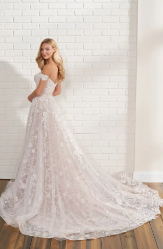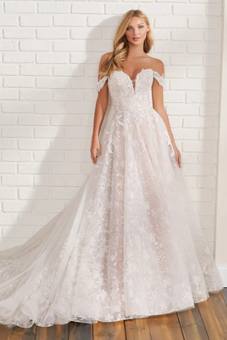 Bridal Gowns- A-Line | Sleeveless tulle and lace full A-line bridal gown features deep V-neckline, bodice with Schiffli lace appliqué, draped lace cap sleeve, full A-line tulle skirt over patterned sparkle illusion, horsehair hem finish, chapel train trimmed with lace appliqué.