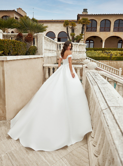 Bridal Gowns- A-Line | Step into your very own fairytale with Vanessa. It features a grand A-line silhouette with rouching at the waist, giving the skirt a fuller appearance. A Basque waistline elongates your torso and adds to the fairytale feel of this bridal gown with its curved boning that cinches you in all the right places. It also features an old-world-style straight neckline with layers of satin that are perfectly draped to enhance your bust. The swag sleeves are perfectly pleated to complement the layers of fabric on the bust. They are constructed to float over your upper arms, giving the gown an undeniably romantic air. The open back keeps things simple while allowing you to show off a little bit of skin. Buttons trail down along the back of the bodice before giving way to a stunning sweep train that can be bustled after you make your dramatic entrance down the aisle. This fairytale wedding dress is available in white if you want a classic bridal hue or ivory for the bride who wants a softer, more natural look.